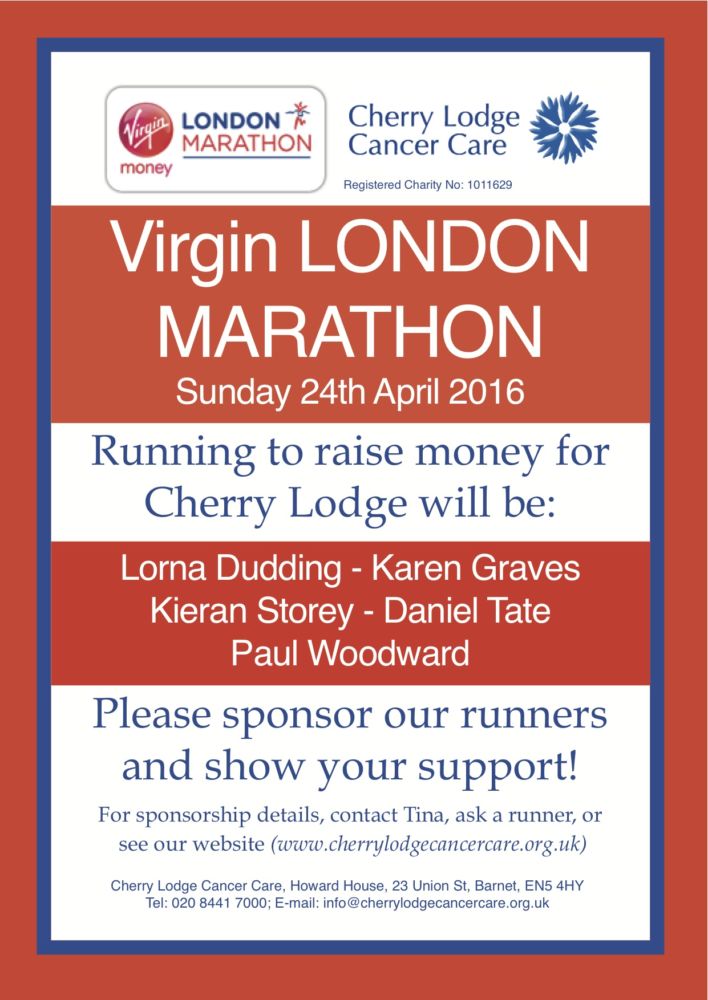 This year Cherry Lodge has a team of five runners, who are all currently training hard to run for us. (Two other people have sadly had to withdraw due to injury.) The physical effort required to take part in this event is enormous – and the least the rest of us can do is to sponsor our runners and so show our support for them and for Cherry Lodge!