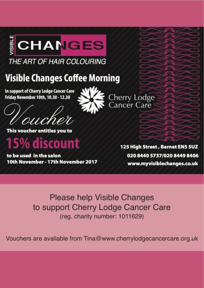 Visible Changes hair and beauty salon at 125 High Street in Barnet is supporting Cherry Lodge Cancer Care by putting on a coffee morning on Friday 10th November 2017, from 10.30 to 12.30.