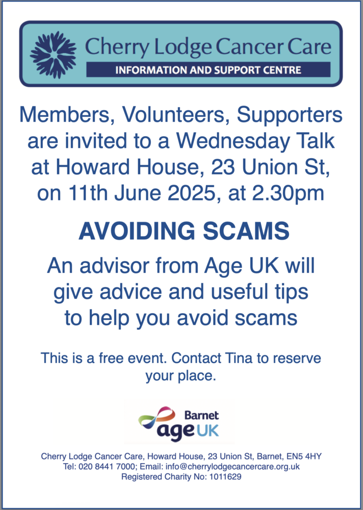 Members, volunteers and supporters are invited to a free talk at the Cherry Lodge centre on Wednesday 11th June, starting at 2.30pm. An advisor from Barnet Age UK will share very useful advice on Avoiding Scams.