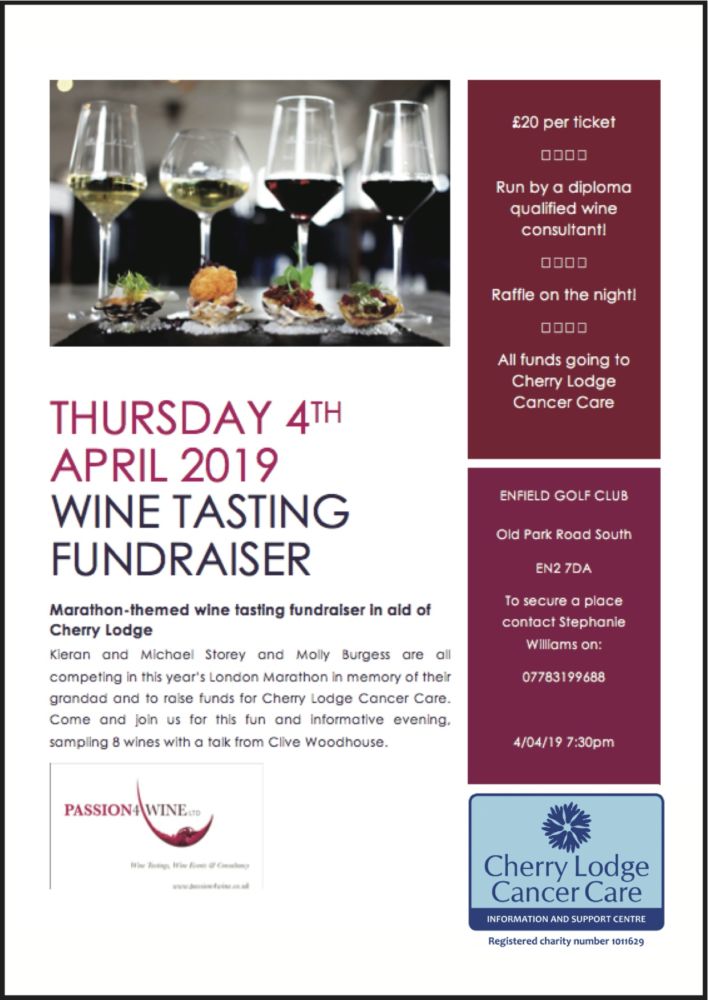 Three people running for Cherry Lodge Cancer Care in the 2019 London Marathon are seeking to raise extra money for us by putting on a wine tasting fundraiser.