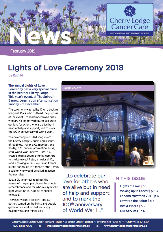 Our new issue begins with a description of Cherry Lodge’s annual Lights of Love Ceremony, held on Sunday 9th December 2018. This is followed by an inspirational account of the experiences of CL member Amanda Wiles, under the very apt title ‘Waking up to Cancer … the power of the human spirit’. We also publish the names of the five runners signed up to run for Cherry Lodge in the London Marathon in April – please sponsor them if you can. Regular features include: ‘Letter to the Editor’ (with information about CL’s Seated Yoga group)’; our ‘Bits and Pieces’ noticeboard; and a summary of CL ‘Services and Approach’.