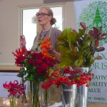It was fascinating to watch Karen building her fabulous display and to be told exactly what she was doing and why. For at least one person in the audience, whose flower arranging has not yet progressed beyond sticking a bunch of supermarket flowers in a glass vase, Karen’s demonstration was an inspiration. it now seems quite possible that I might be able to line a pumpkin with cellophane, to use oasis to hold and provide water for the plants, to use leaves and flowers with thick stems early on in the creative process, to balance the colours and to make sure that the display looks good from whichever direction it will be seen.
