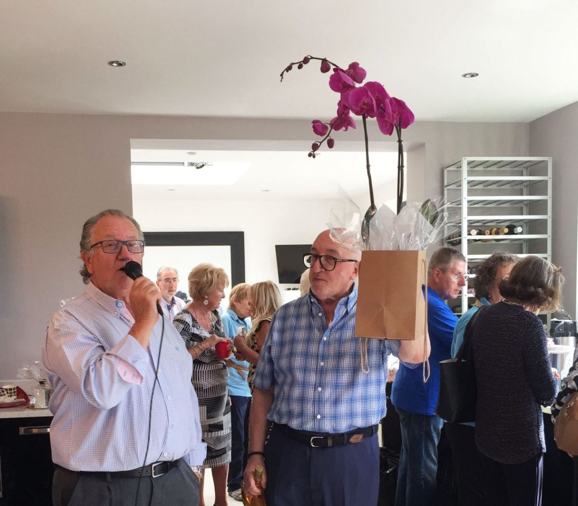 Words of thanks, with an explanation of the purpose of each charity, were given by Carole (at right in photo 1, below) on behalf of Parkinson’s and by Margaret for Cherry Lodge. They were followed by Myra, who thanked everyone for supporting this event so generously. The proceedings included an extensive raffle with some excellent prizes and an impressive auction conducted most ably by Norman and his great friend Brian. Although Archie the spaniel had to be excluded from most of the proceedings he was eventually joyfully welcomed in and showed his appreciation by hoovering up dropped titbits with relish.