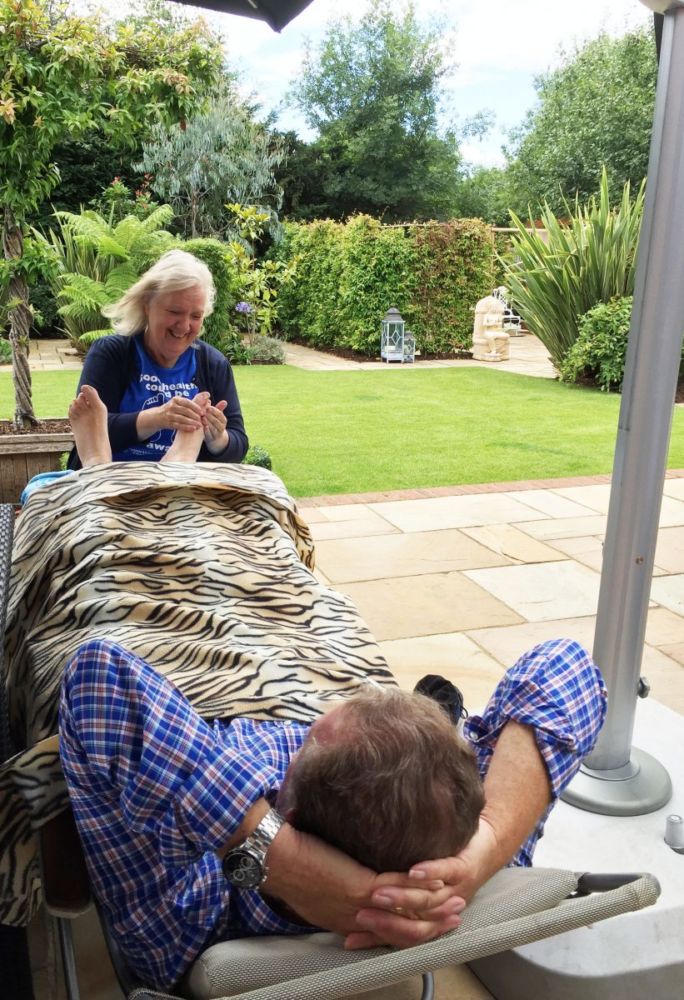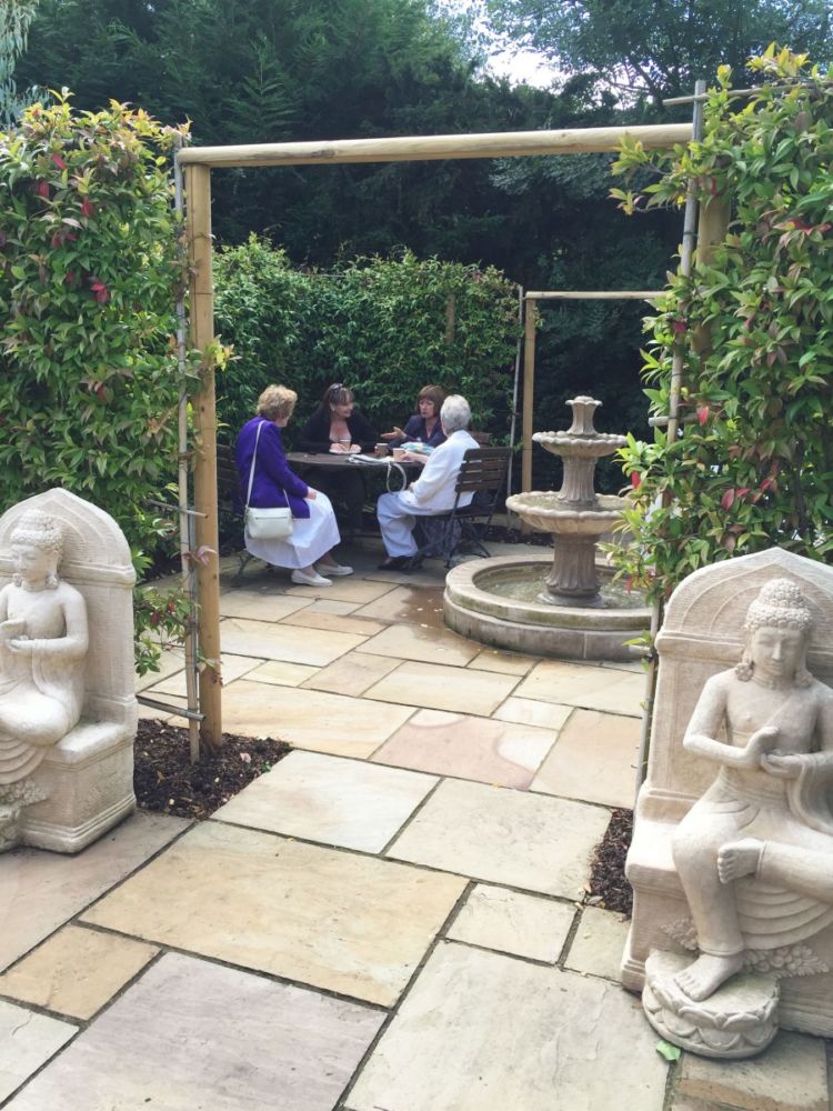 The day’s focus was undoubtedly the delicious brunch and the non-stop service from the tea and coffee bar, the latter run by Cherry Lodge volunteers. Equally busy were the two therapists providing reflexology and head and neck massage/reiki, which they carried out against the backdrop of the truly stunning garden with its very relaxing water features. Entertainment was provided by a remarkable singer whose lovely voice carried well over the chatter and laughter of the audience.