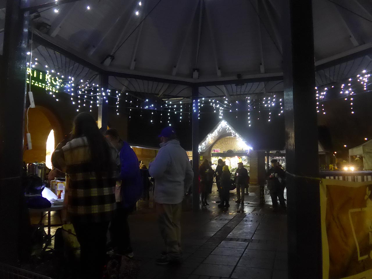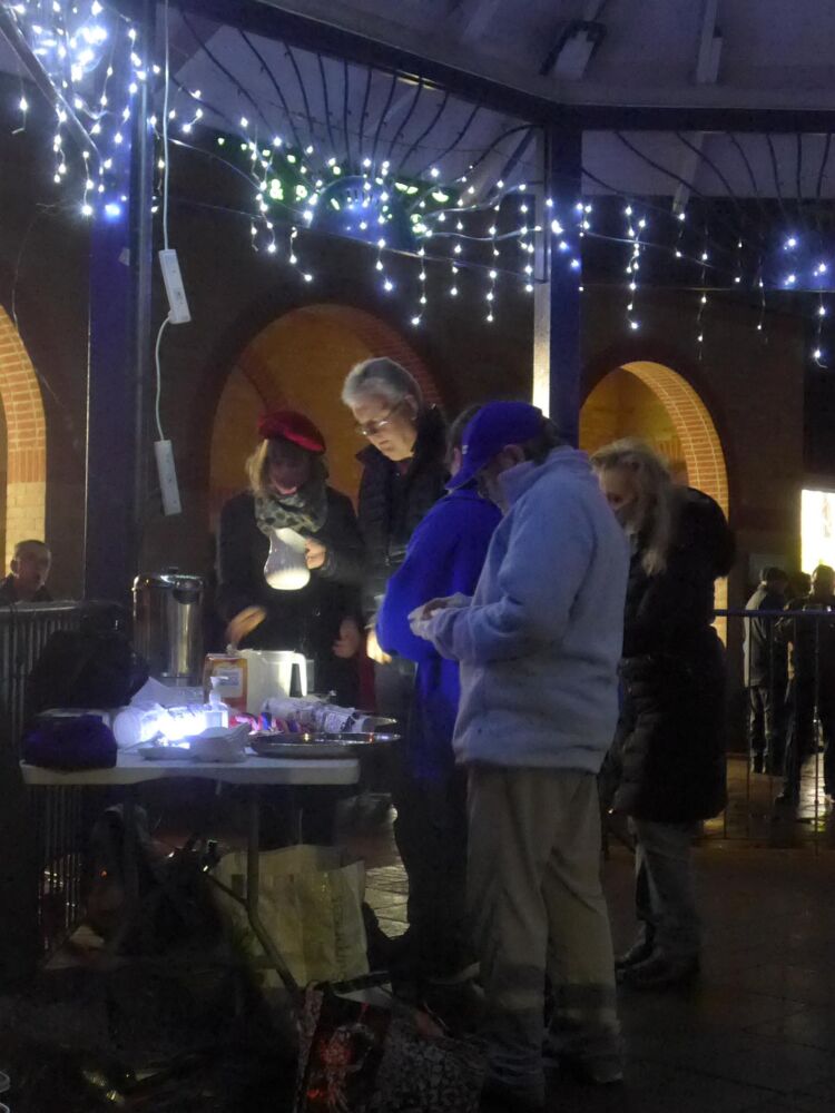 Instead of gathering in close proximity around the bandstand table for refreshments, people chatted at distance while enjoying the mince pies and mulled wine brought to them by masked volunteers. The event was not quite back to normal – but it was as nearly so as possible – and certainly very moving!