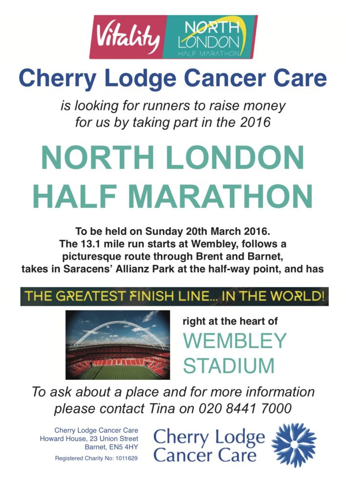 Cherry Lodge is now looking for runners to take part on our behalf in the 2016 Vitality North London Half Marathon. We need money from sponsorship to help fund our much needed information and support services for North Londoners affected by cancer.