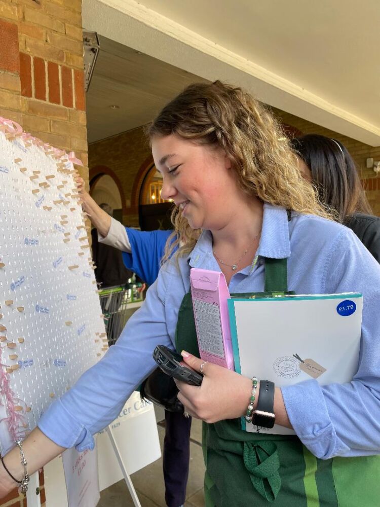 Compared with last year the weather was most pleasant and the hundreds of pink gifts donated by our very generous supporters attracted a steady stream of people keen to try their luck. The usual system of drawing tickets from a bucket (a possible Covid risk) was again replaced by the clever invention of Annys and Kim. The draw was from a polystyrene board with some 1000 holes in it, each hole containing a stick to be pulled out. Sticks with a red tip won a prize.