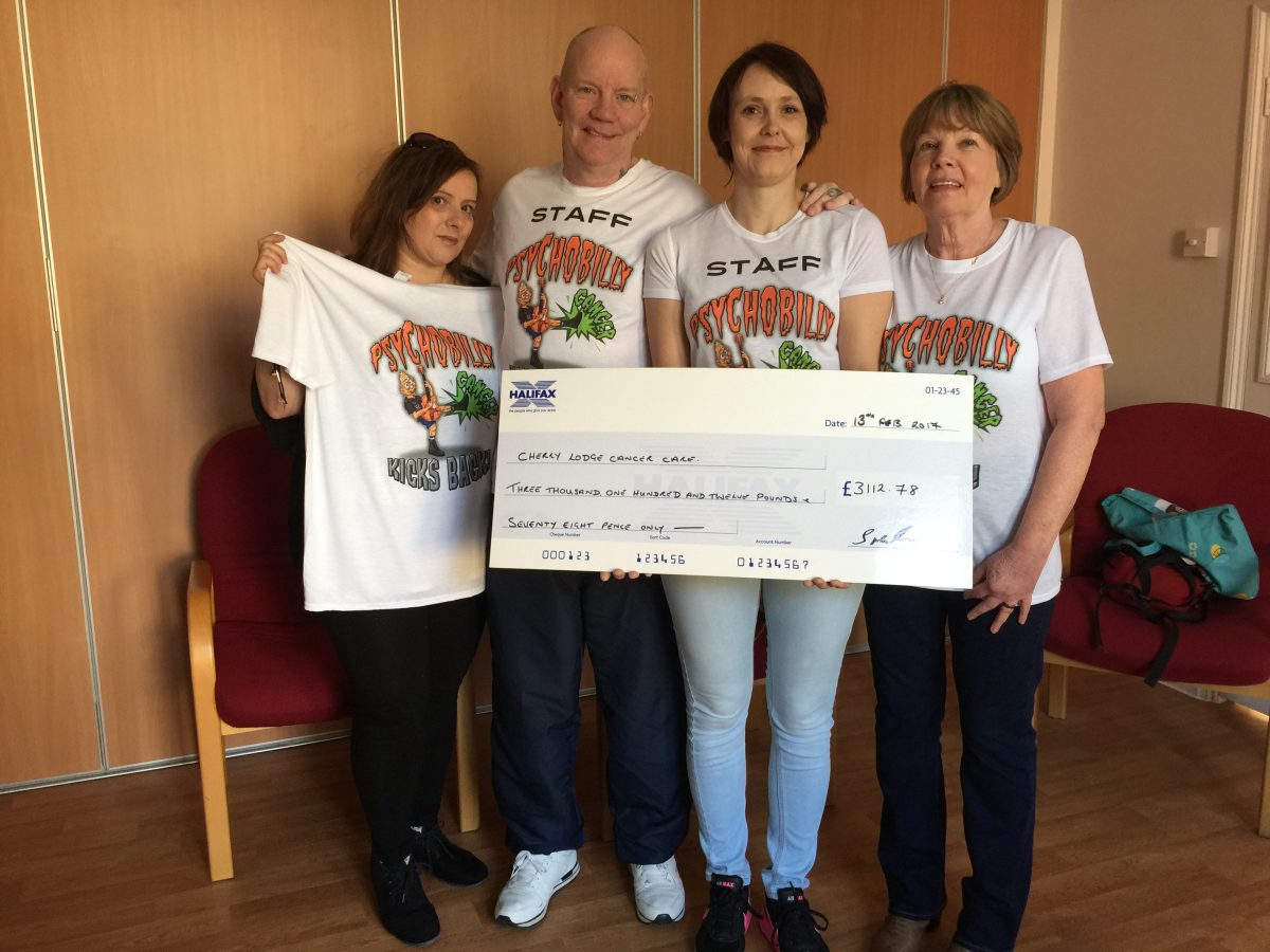 Monday 13th February 2107 saw the handing over of a fabulous big cheque by Ginger Meadham and family to Tina Papasavva, Cherry Lodge’s Fundraising Events Coordinator. Cherry Lodge was thrilled with the result and it is now our turn to send huge thanks to Ginger and family, and to everyone in the psychobilly world who helped support us!