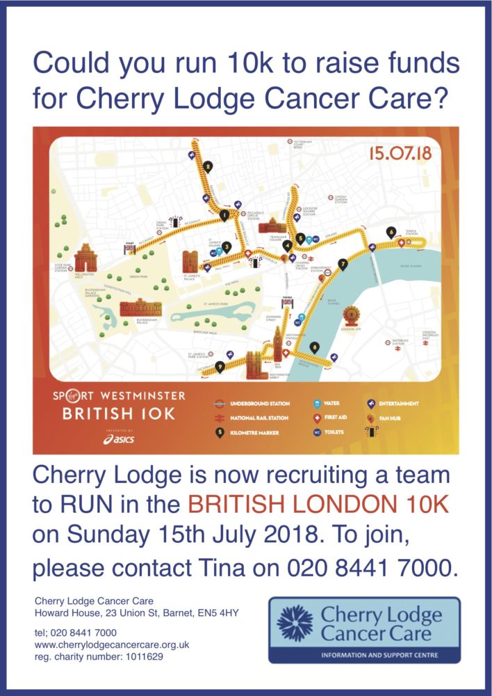 Cherry Lodge Cancer Care is looking for runners to take part in the Virgin Sport British 10K in London on Sunday 15th July 2018. This is a fun event and a great way to raise funds for Cherry Lodge’s much needed information and support services, which are provided free of charge to people affected by cancer, including family members and carers.