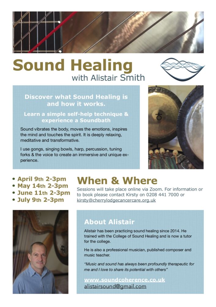 Cherry Lodge Cancer Care now has the funding to offer an exciting new healing option: Sound Healing with Alistair Smith of Sound Coherence. Sessions will be via Zoom and last for an hour.