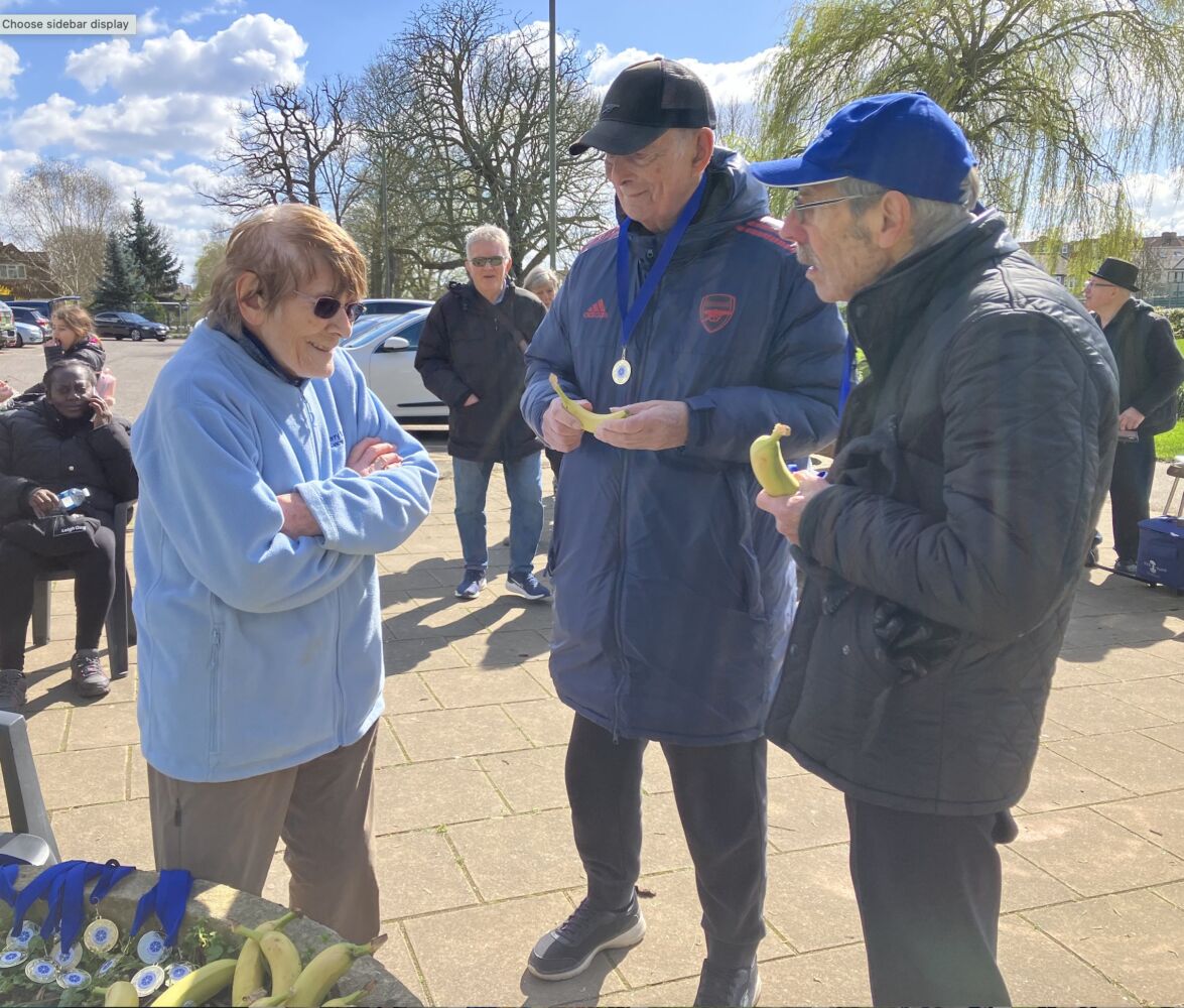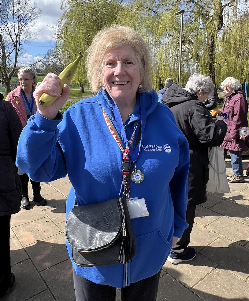 Completing the circuit was no mean feat for some of the walkers – and we applaud them. One walker, Annys (CL volunteer, assistant shop manager and now a member) commented that this was the furthest she had walked since starting her cancer treatment. It transpired that she had done even better than she thought, finding out only afterwards that the course was one mile not one kilometre long! Everyone who completed the walk was awarded a medal – and a banana! – by CL founder Margaret, who has led the walk in previous years.