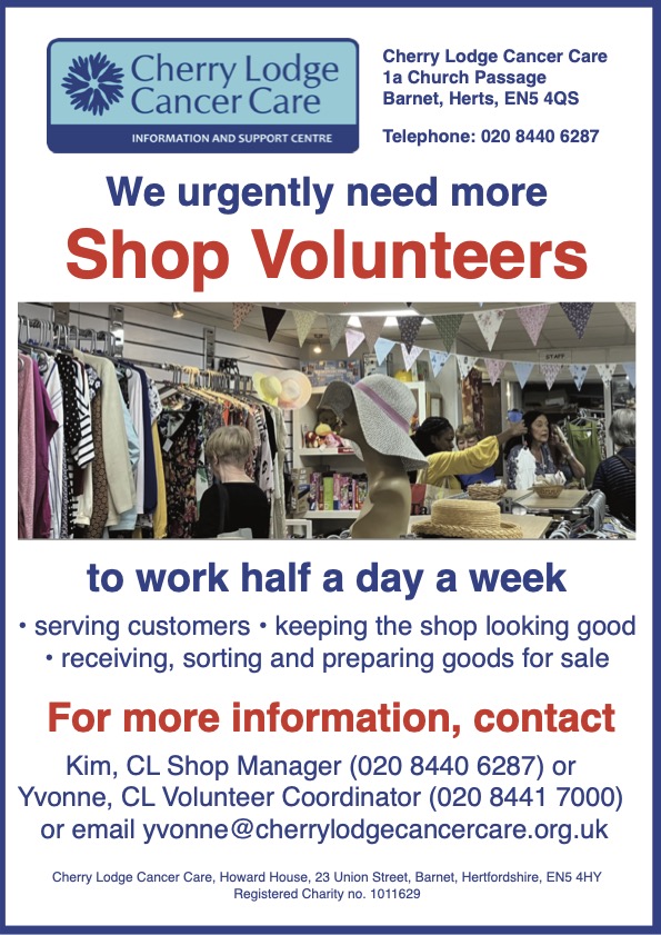 Might you be able to give some time to make our shop as profitable as possible to help fund Cherry Lodge’s much needed cancer information and support services?