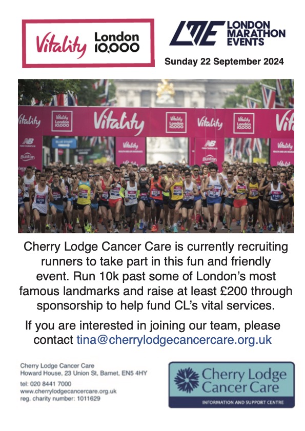 Cherry Lodge Cancer Care will have a team of runners taking part in the 2024 Vitality London 10,000 run on Sunday 22nd September 2024. This is a fun and friendly 10k race, suitable for beginners and experienced runners, around the streets of London. The course starts and ends near Buckingham Palace and goes past some of the city’s most famous landmarks, including Trafalgar Square, St Paul’s and the Houses of Parliament.