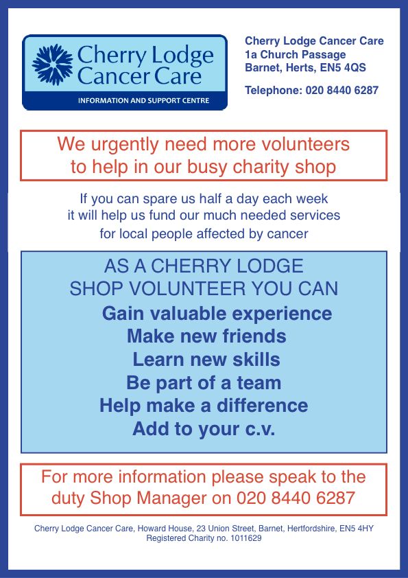 The Cherry Lodge Cancer Care shop in Church Passage, Barnet urgently needs more volunteers. Might you be able to give some time to make our shop as profitable as possible to help fund Cherry Lodge’s much needed cancer information and support services?