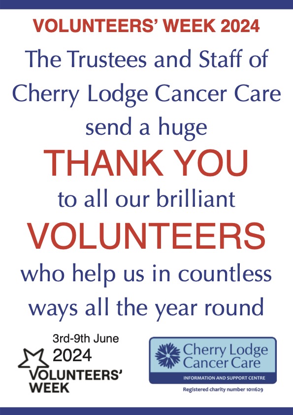 I started volunteering at Cherry Lodge over 20 years ago when both my daughters were at school. Whilst I have very occasionally helped out on reception and with fundraising events, my regular spot was the Tuesday morning drop in. I have always thought it was a privilege to have met so many people over the years and to see CL doing what it does best. More importantly, it was lovely to see how much support the members offered each other. I still miss it and although I have popped in to the new (offsite) drop in, my involvement with CL these days is less regular. I periodically visit the centre to keep the Macmillan leaflets up to date and I like to catch up with whoever is in that day. When I started I had no idea that it would lead to such a rich and rewarding experience for such a long time.
