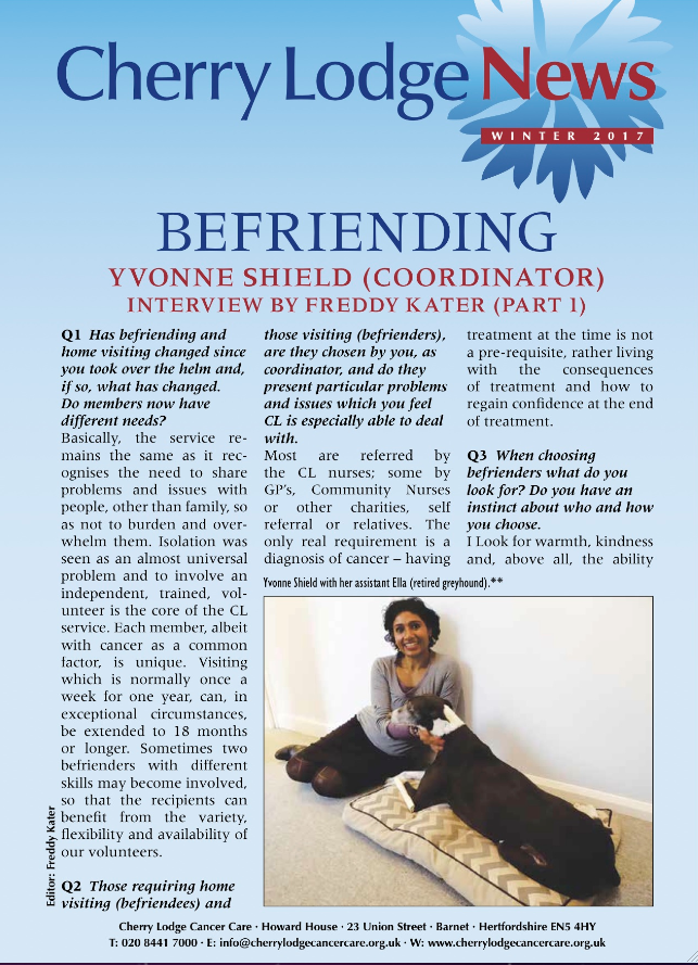 - an interview with Yvonne Shield (CL’s Macmillan Home Visiting & Volunteer Coordinator) about CL’s very valuable Befriending and Home Visiting service