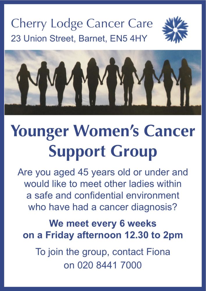 Cherry Lodge Cancer Care is now seeking to increase membership of our newest support group. This group is specifically for ladies aged 45 or under who have been diagnosed with any type of cancer. It meets every 6 weeks on a Friday afternoon from 12.30pm to 2pm at the Cherry Lodge centre, Howard House, 23 Union St, Barnet, EN5 4HY.
